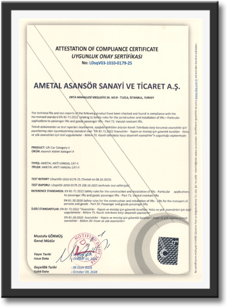 Bina tipiniz ne olursa olsun, Ametal asansörleri en yüksek standartlar çerçevesinde hizmet verir. Avrupa, Orta Doğu, Afrika ve Avrasya ülkelerine sunduğumuz tüm ürün ve hizmetlerimiz uluslararası gereklilikleri ve düzenlemeleri karşılar. Sahip olduğumuz sertifikalarımız aşağıdaki gibidir.